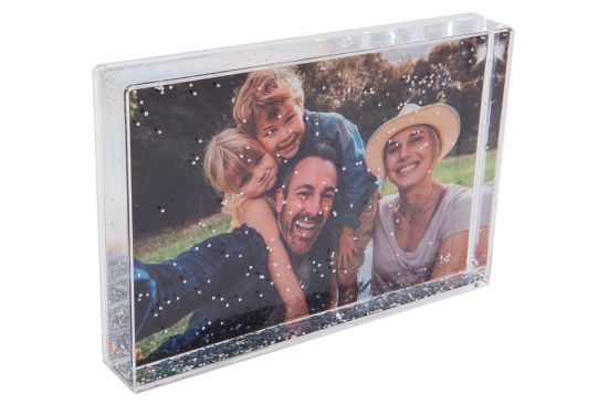 Measuring 4[quot] x 6[quot], the photo or artwork insert slides neatly into the back of the acrylic block, which is a solid and self-standing item for display in any room, and provides a seasonal or happy touch with the glitter-filled liquid section sitting in front of the image to create life and depth around the picture.